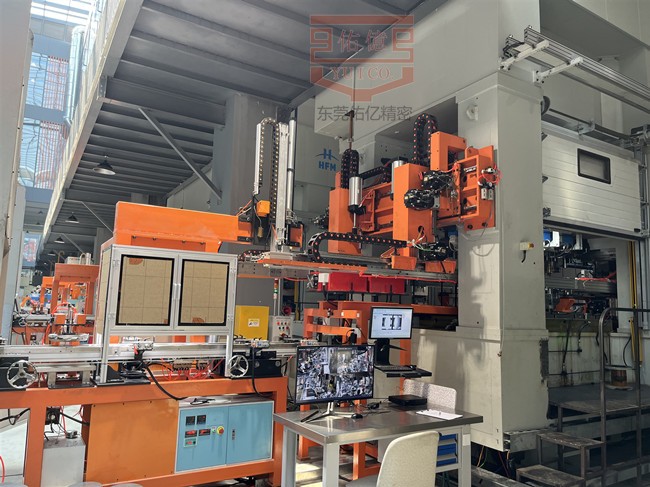整套自動化系統由取料機械手、磁性輸送帶、NC 三次元機械手、成品輸送帶組成,配備CCD視覺系統檢測,整體自動化沖壓生產線包含有整體拉伸,邊緣拉伸,旋切切邊,沖孔整平,以及去毛刺修邊等工藝。